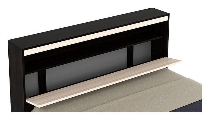 Изголовье кровати представляет собой откидной блок с дополнительной секцией для хранения постельных принадлежностей (подушек, одеял и постельного белья). Очень практичное решение, особенно в том случае, когда количество жилого пространства ограничено. Кровать не только украшает интерьер, но и делает спальное место поистине комфортным и функциональным. По бокам кровати две высокие приставные тумбы. Сверху тумб – горизонтальная полка, которая делит пространство пополам и позволяет разместить негабаритные предметы интерьере – семейные фотографии, свечи, книги, интерьерные часы. Внизу тумбы распашная дверца – еще одно полезное пространство для хранения.
