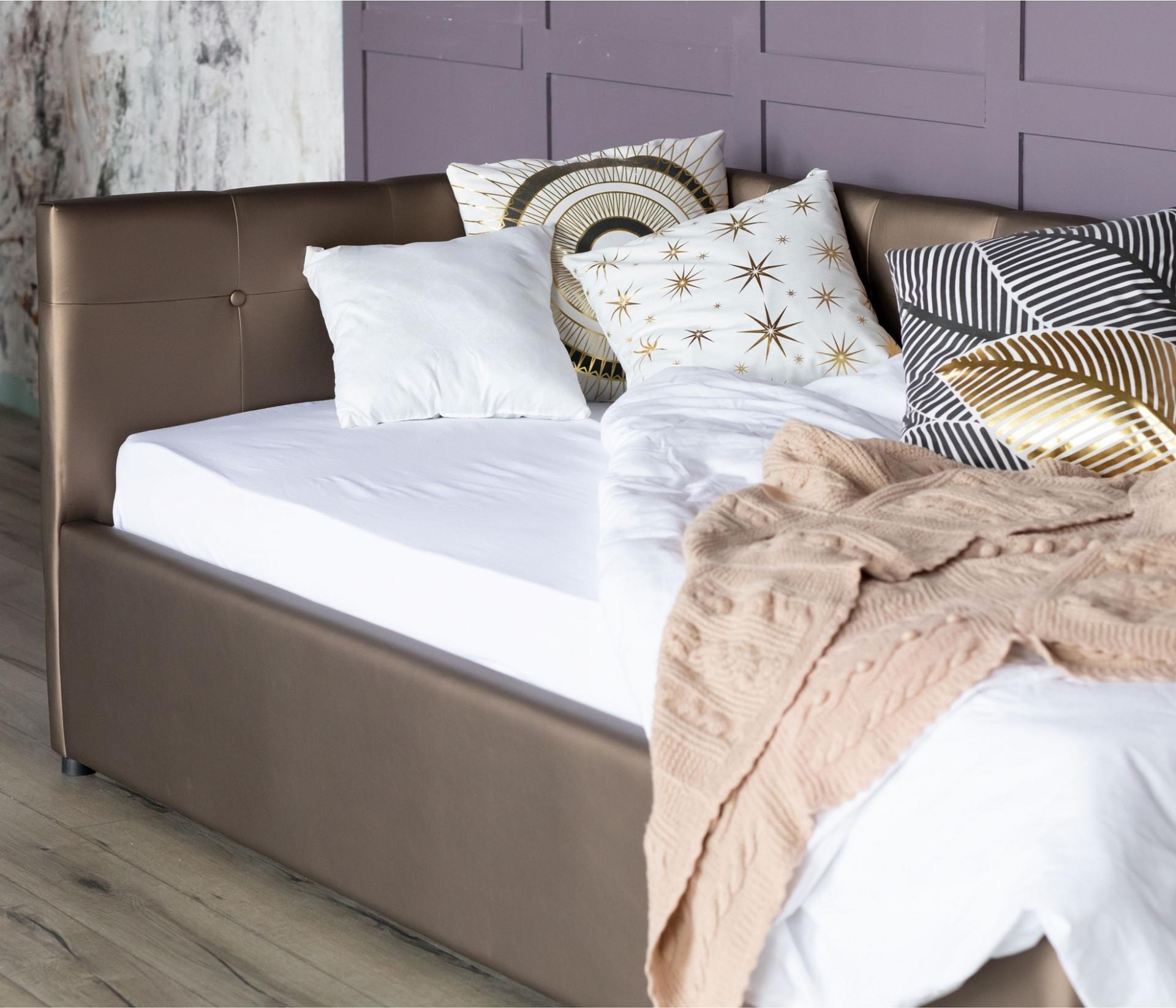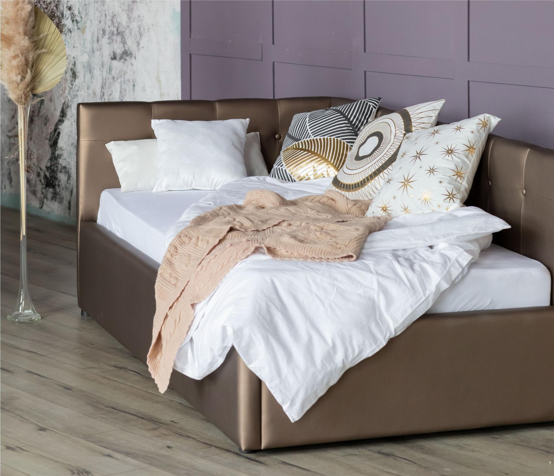 Интерьерная кровать-тахта имеет усиленное металлическое основание с амортизирующими ортопедическими ламелями.