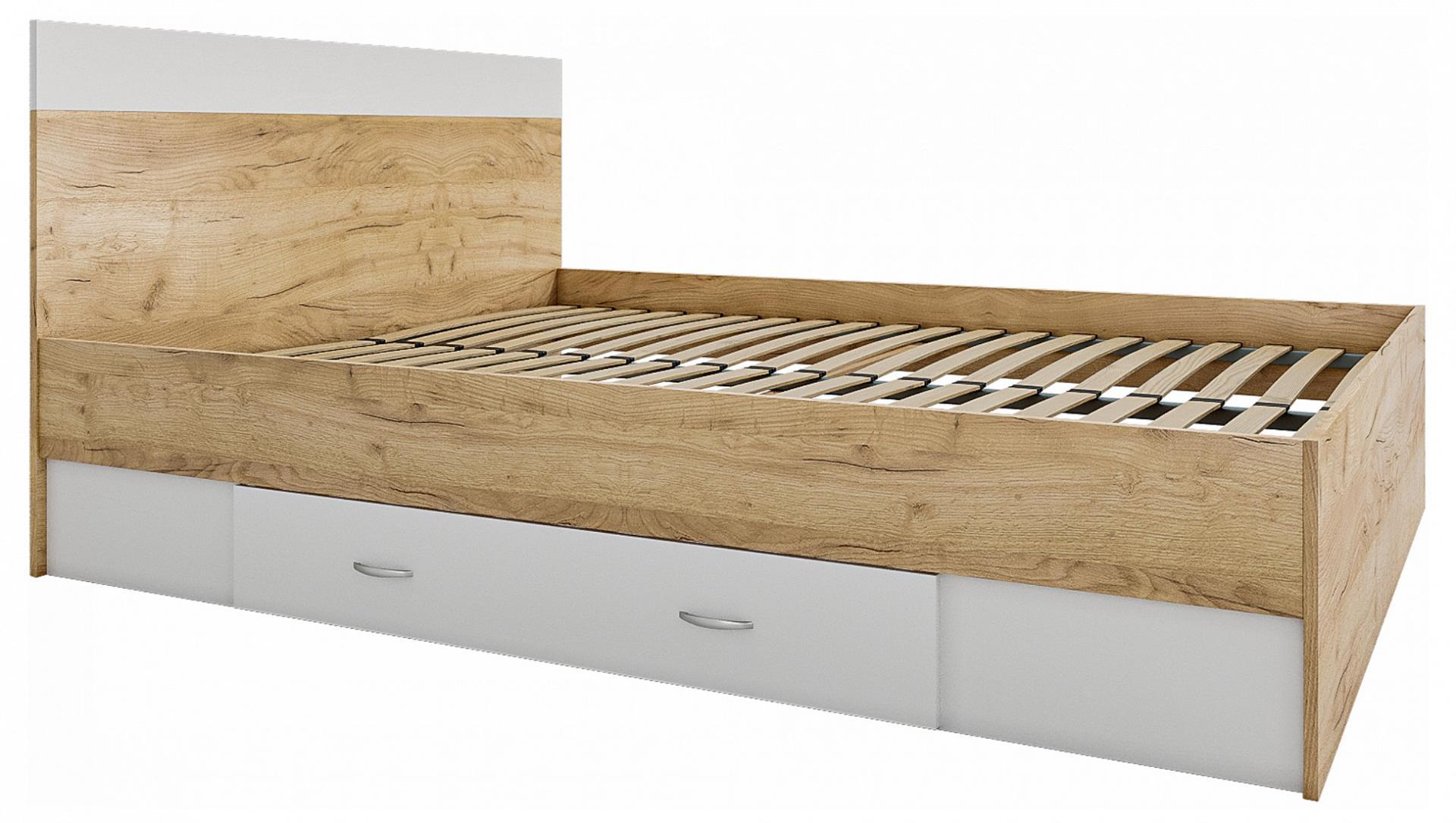 Изголовье кровати выполнено с сочетанием двух текстур – дуб золотой и белый.