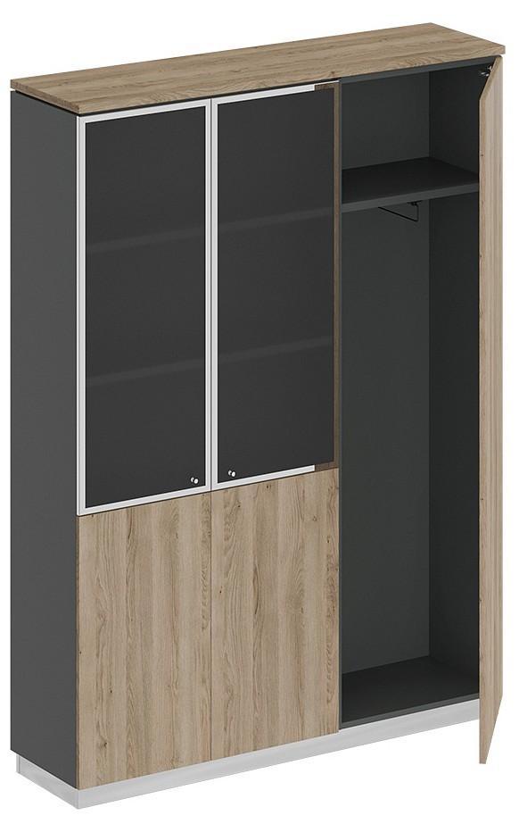 Шкаф состоит из шкафа для документов со стеклом, узкого шкафа для одежды под общим топом и цоколя на 2 шкафа.