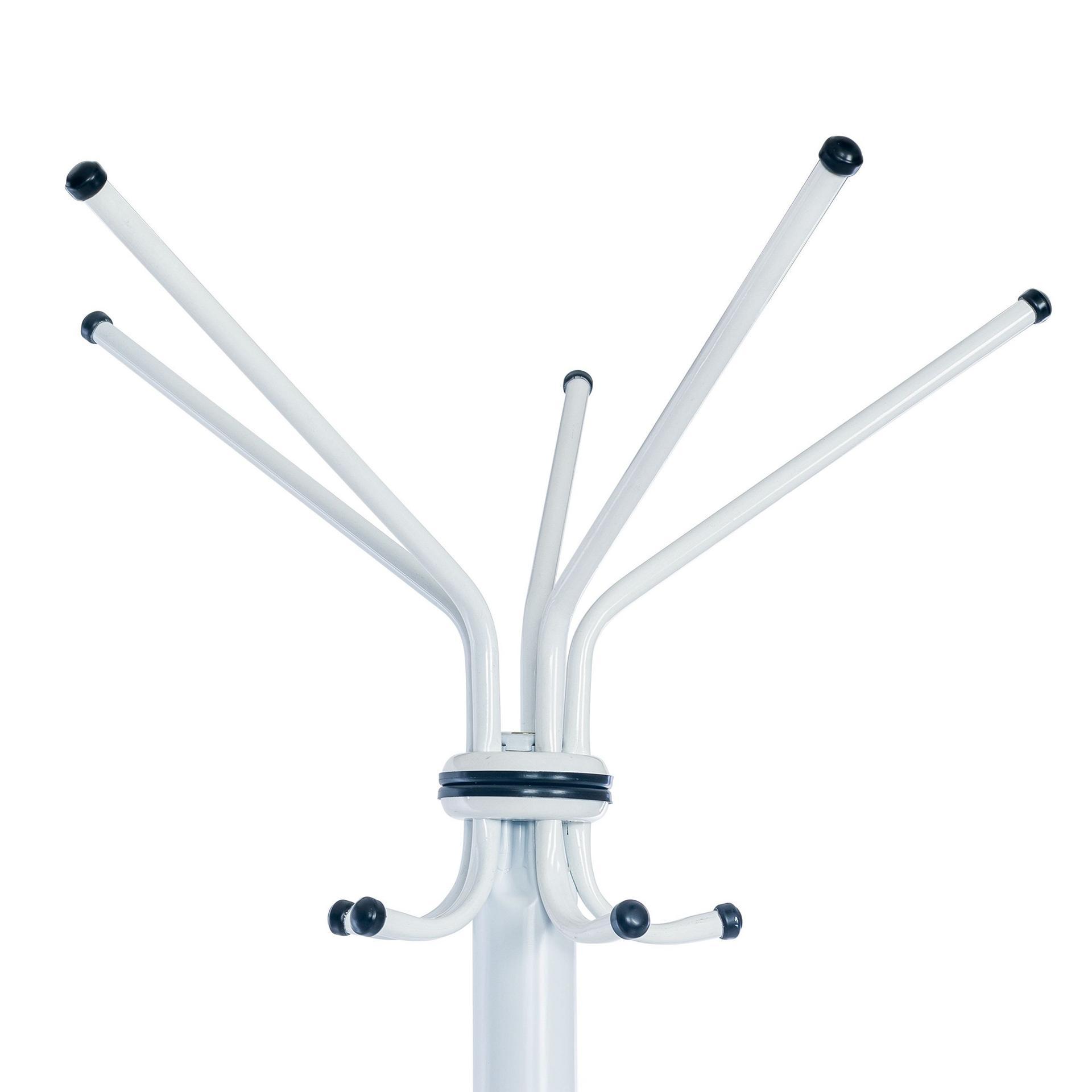 Внешне это просто металлическая труба с длинными и короткими крючками в верхней части изделия. Внизу находится круглое основание, которое делает вешалку максимально устойчивой.