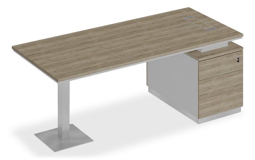 Стол состоит из столешницы, заглушки кабель-канала, металлической опоры и опорной тумбы.