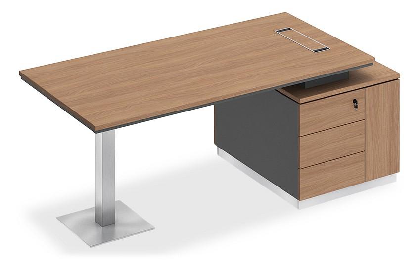 Стол состоит из столешницы, заглушки кабель-канала, металлической опоры и опорной тумбы.