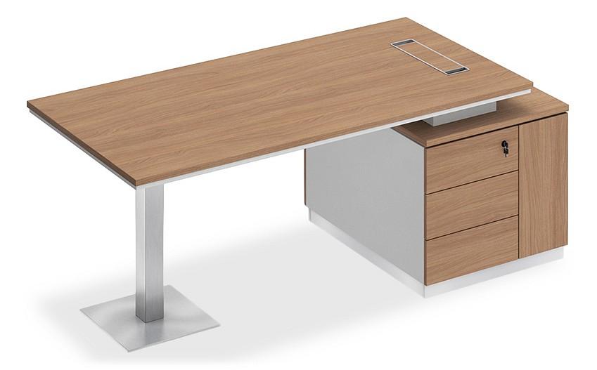 Стол состоит из столешницы, заглушки кабель-канала, металлической опоры и опорной тумбы.