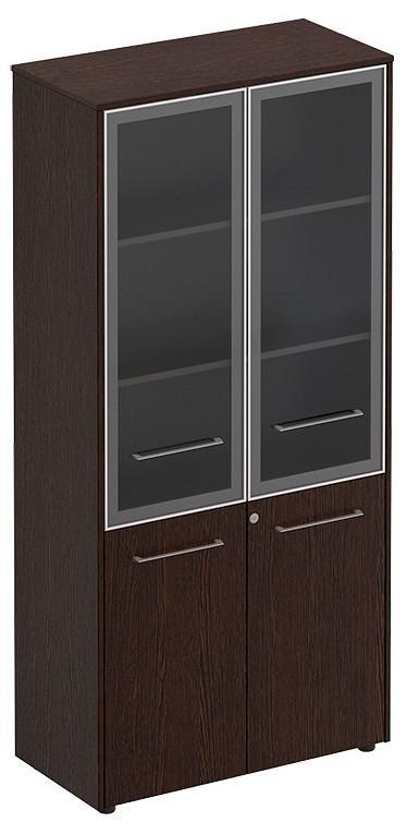 Шкаф укомплектован двумя стеклянными дверями в металлической рамке без замка и двумя дверями из ЛДСП с замком на правой двери.