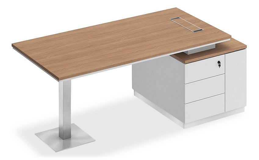 Стол состоит из столешницы, заглушки кабель-канала, металлической опоры и опорной тумбы.