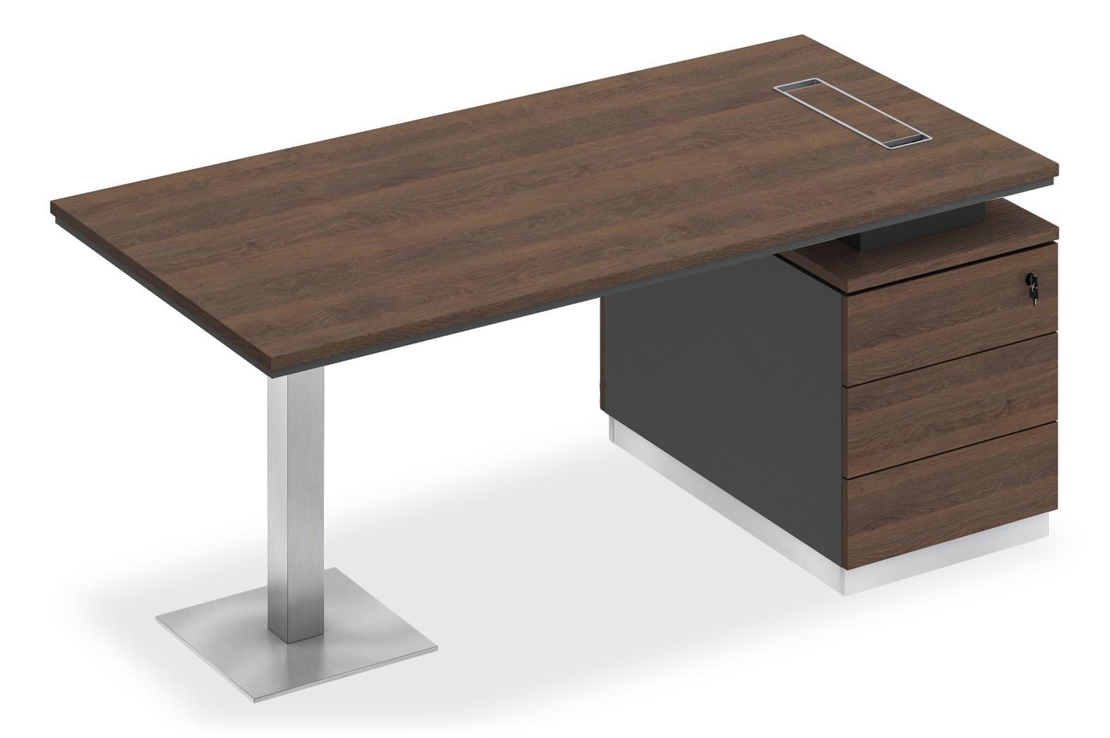 Стол состоит из столешницы, заглушки кабель-канала, металлической опоры и опорной тумбы.