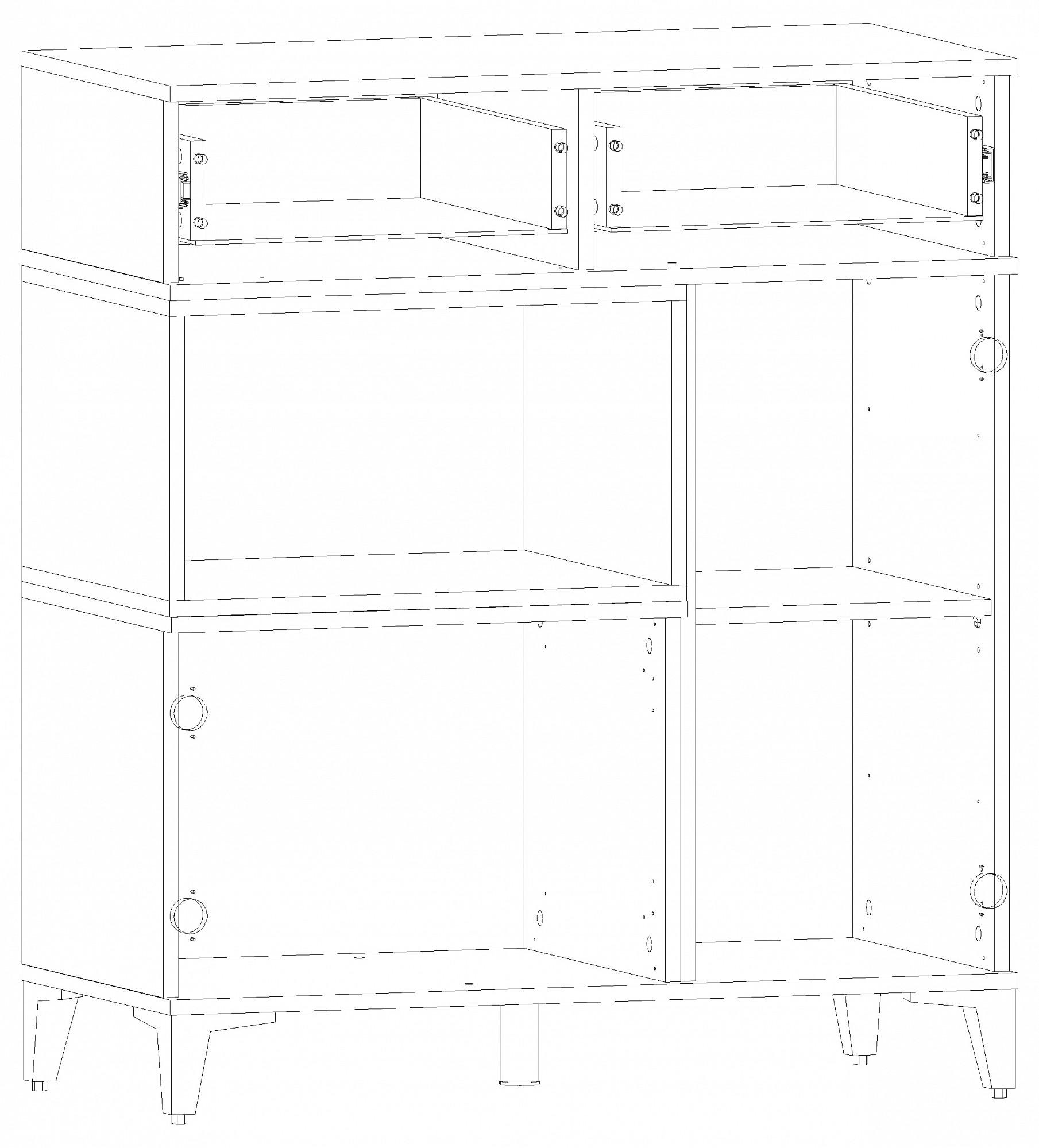 Тумба с выдвижным ящиком на шариковых направляющих, с двумя распашными дверцами и открытой полкой.