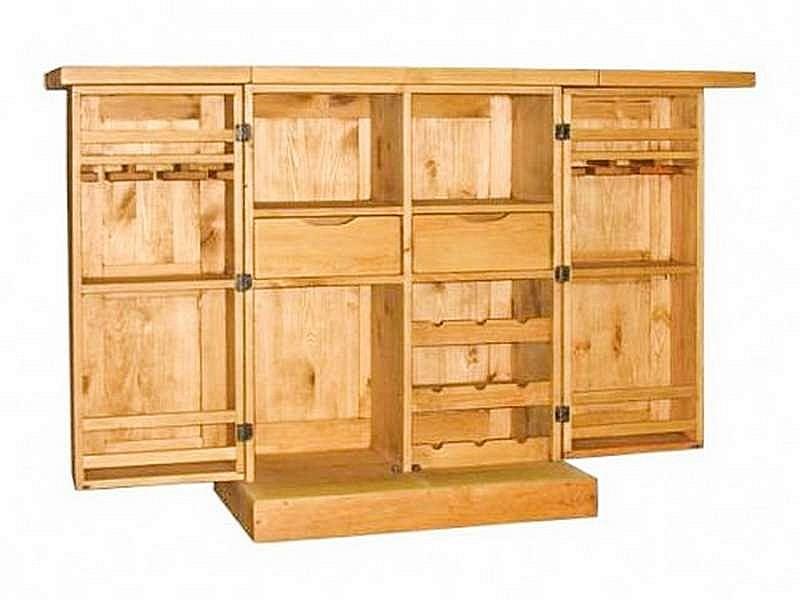 При открытых дверях ширина барной стойки составляет 169 см. Торцевые части столешницы и крыльев (толщиной 4 см) укреплены поперечными вставками. Внутри бара размещены несколько полок, два ящика, полки для хранения бутылок. В дверцы сверху встроены kit-бары для хранения бокалов.