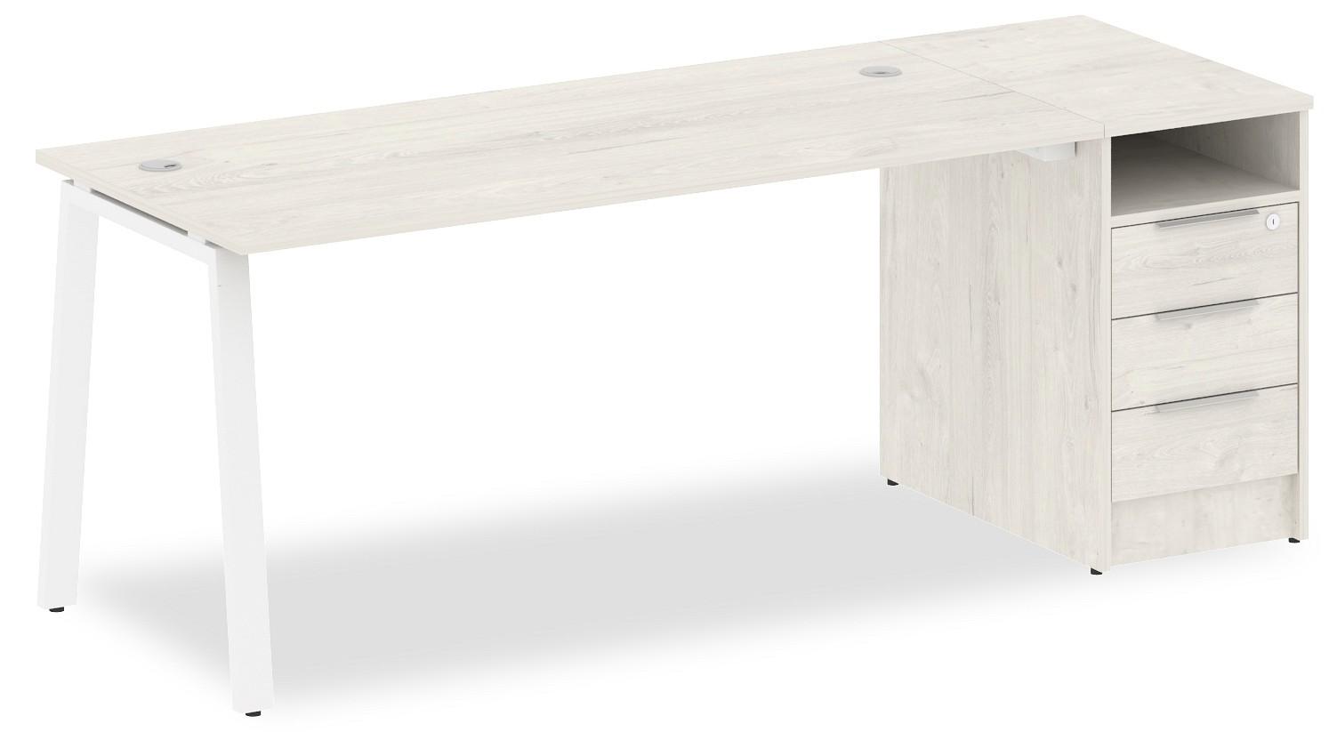 • 3 ящика. Для изготовления корпуса был выбран ЛДСП Е1, металл в оттенке белый, дуб наварра, завершает дизайн матовый верхний слой, гармонично сочетающийся со столешницей. Купить данную модель вы можете по привлекательной цене, равной 23156 руб.