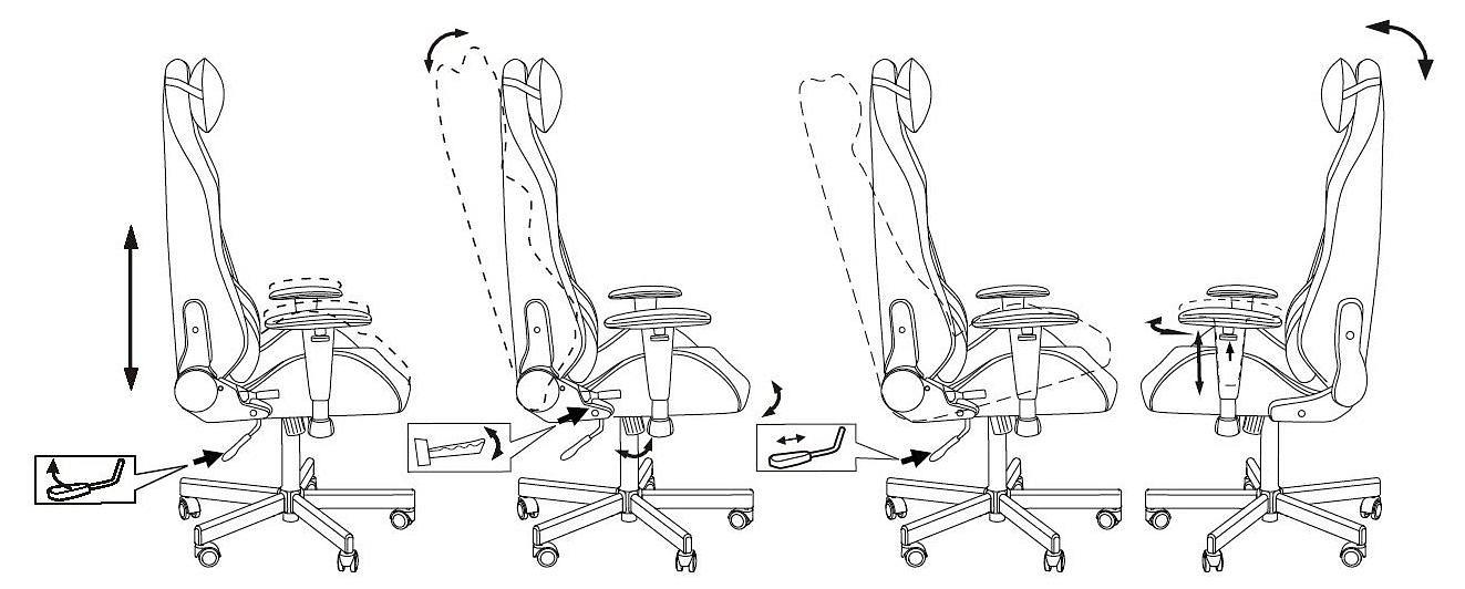 Механизм качания с возможностью фиксации в вертикальном положении. Регулировка высоты (газлифт). Регулировка угла наклона спинки (реклайнер 90-150 градусов). Поддержка шеи и поясницы (2 эргономичные подушки). Подлокотники пластиковые 2D. Каркас стальной. Крестовина металлическая разборная. Колеса для паркета и ламината.