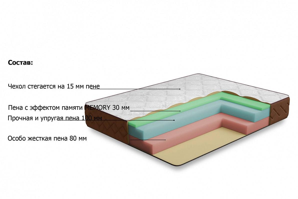 Основу матраса составляют 3 вида премиальной пены. Верхний слой - пена с памятью формы, которая создает воздушность и комфорт, точно повторяя и запоминая, каждый изгиб тела. Средний слой- слой пены, которая обладает исключительной упругостью, этот слой принимает на себя основную нагрузку и распределяет ее по всей поверхности, оказывая обратное давление лишь там где это необходимо. Нижний слой сделан из особожесткой и прочной пены, которая и позволяет матрасу выдерживать очень высокие нагрузки на спальное место (до 150 кг). Чехол матраса выполнен из особо мягкого трикотажа высокой плотности, итальнского производства, ткань чехла не впитывает запахи и легко отмывается. Бурлет (бок) матраса выполнен из мебельной ткани, которая придает ему законченный вид и увеличивает срок его службы. Чехол стегается на 15 мм пене.
