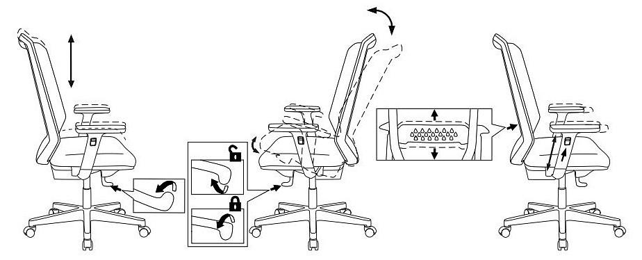 Синхромеханизм качания с регулировкой под вес и возможностью фиксации в нескольких положениях. Поясничная поддержка спины с регулировкой по высоте. Подлокотники 3D. Регулировка высоты - газлифт.