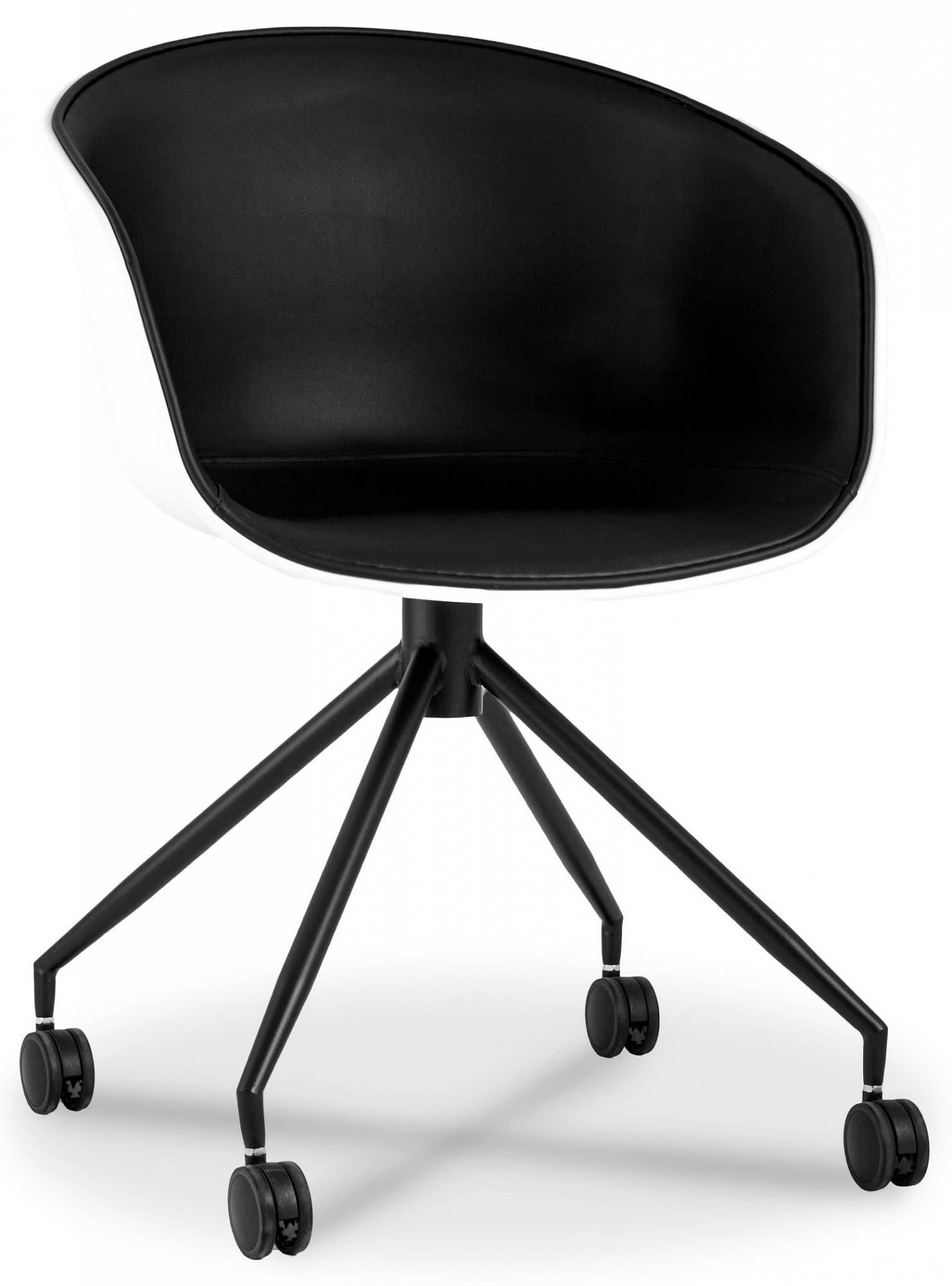 Белая спинка изготовлена из прочного PP-пластика, внутренняя обивка и подушка на сиденье – из экокожи в черном цвете. Крестовина выполнена из металла, окрашенного порошковой краской в черном оттенке. Кресло оборудовано колесиками для более удобного пользования. Высота сиденья не регулируется.