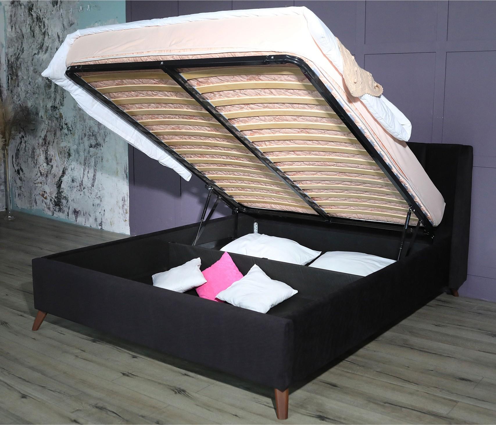 Мягкая интерьерная кровать на ножках Betsi с подъемным механизмом – истинное королевское украшение любой спальни.