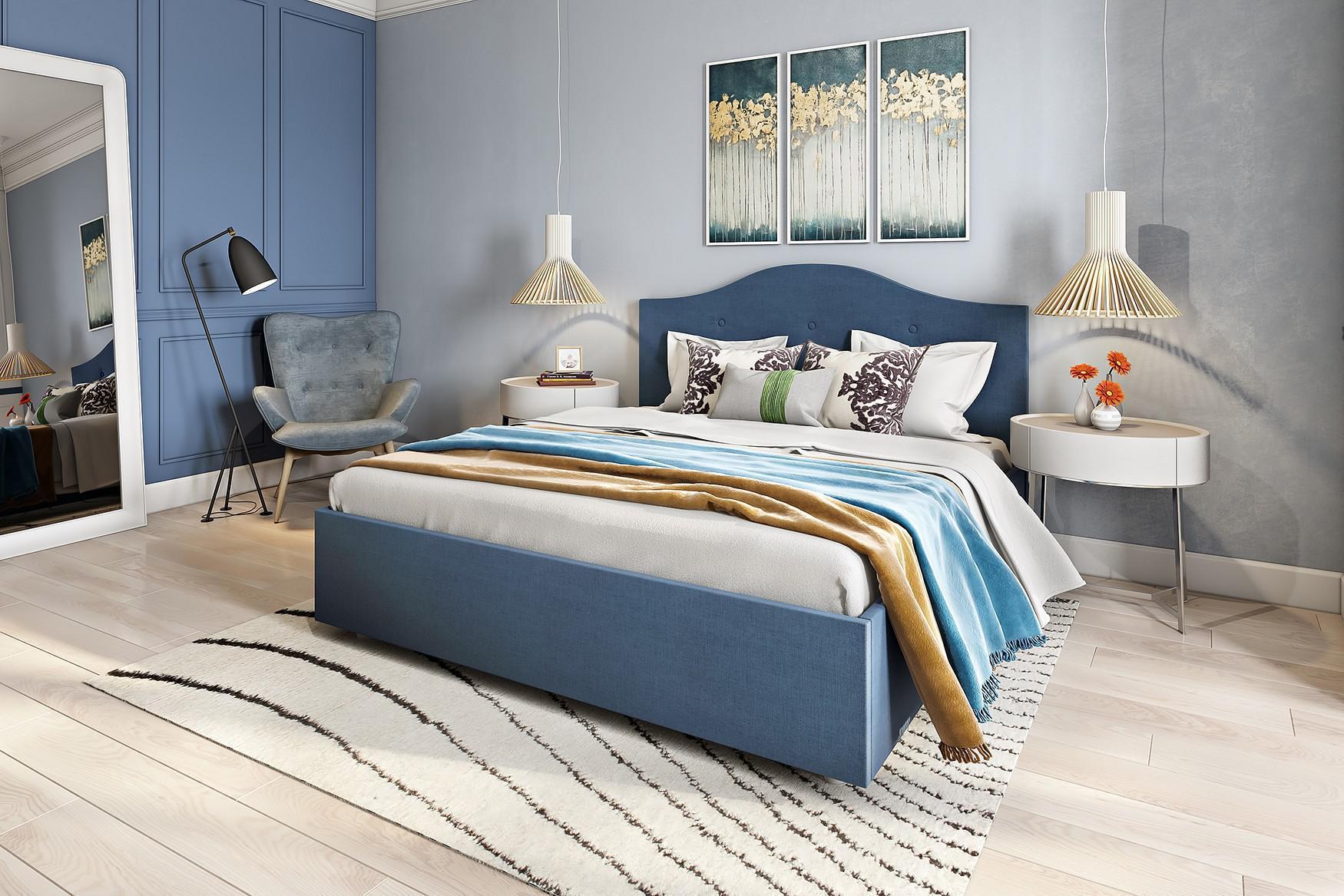 Элегантная интерьерная кровать с изголовьем украшенным декоративными пуговицами. В комплект кровати входит кроватное основание. Каркас основания выполнен из металла, ламели - из берёзы.