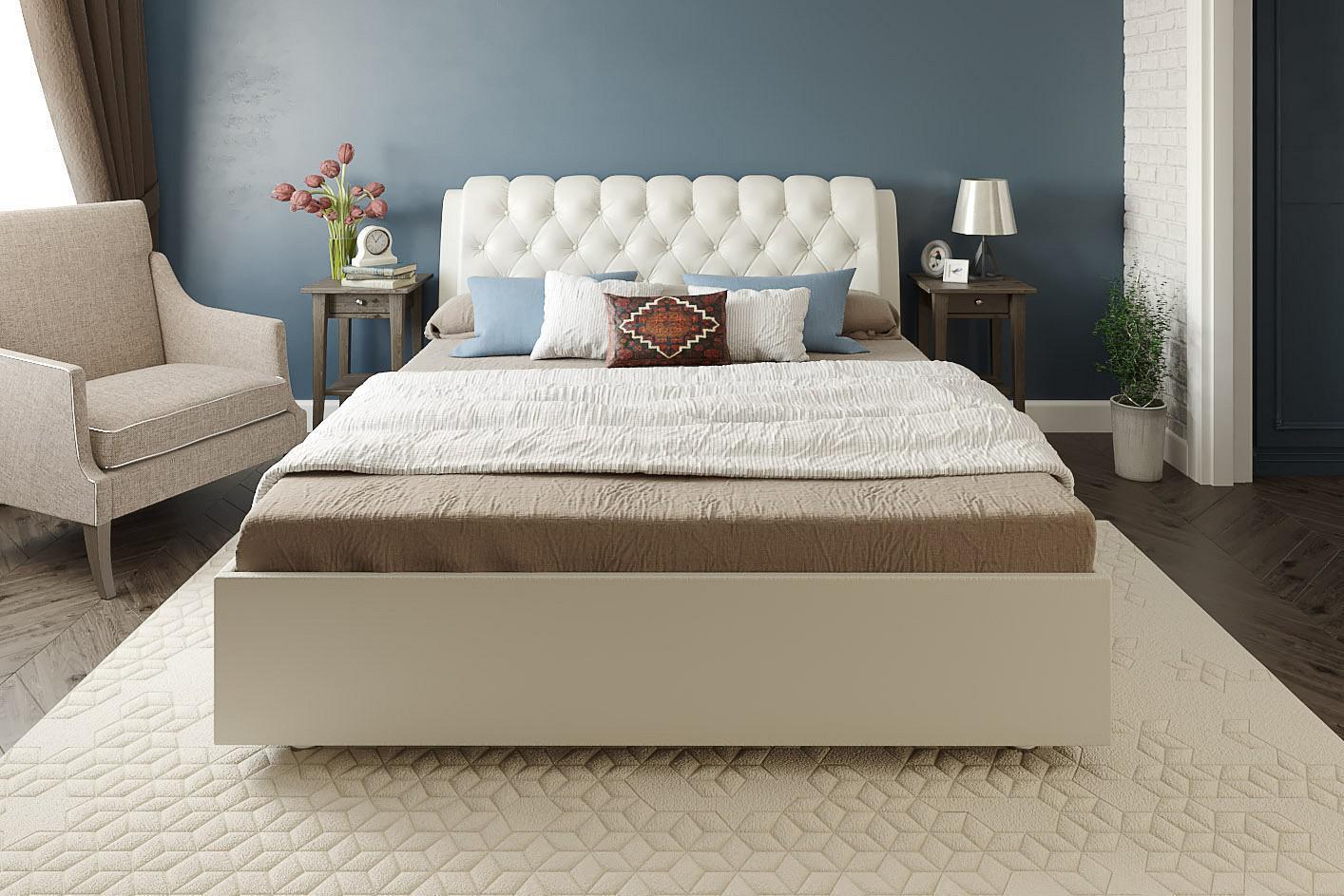 Элегантная интерьерная кровать с изголовьем, украшенным декоративными пуговицами и глубокой пиковкой. В комплект кровати входит кроватное основание. Каркас основания выполнен из металла, ламели - из берёзы.