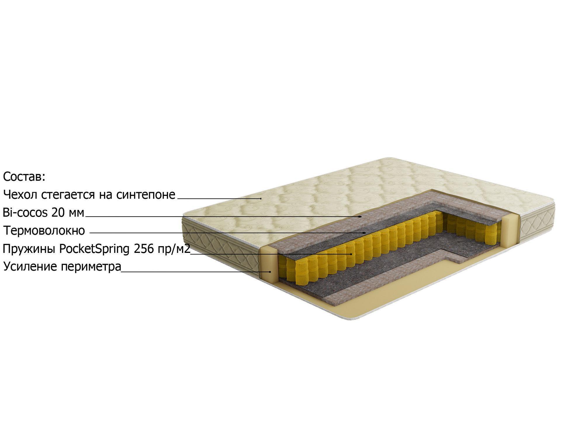 В качестве комфортного слоя используется Bi-Сocos толщиной 20 мм, данный материал изготавливается из латексированный стружки кокосового волокна, придает спальному месту необходимую жесткость и ровность, материал очень долговечный и прочный.