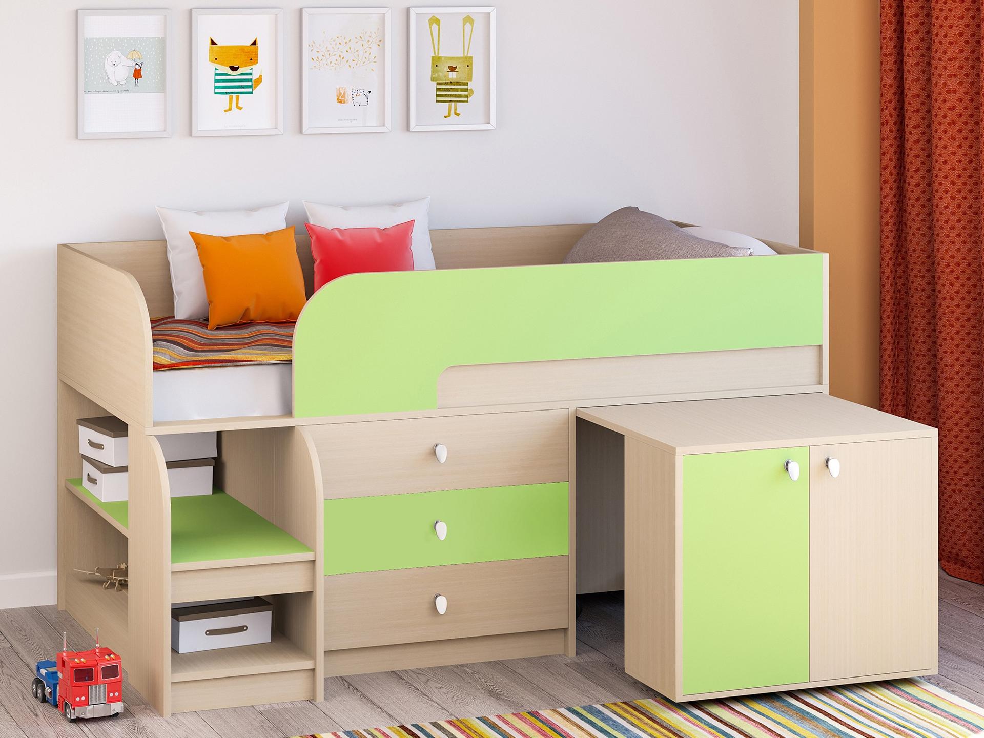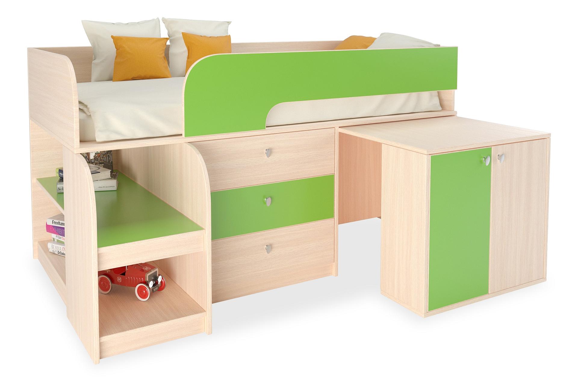 Ваш ребенок вырос и наступила пора обновить мебель в детской? Набор для детской Астра 9/7 RVM_ASTRA9-V7-1-5 – отличное решение, которое понравится не только вам, но и будущему маленькому хозяину или хозяйке. Изделие изготовлено известным брендом РВ-Мебель (Россия) и входит в серию «Астра 9/7». Эффектный матовый корпус оттенка дуб молочный, салатовый смотрится изысканно и изящно, гармонично дополняя фасад, изготовленный из надежного и оптимального для детской материала (ЛДСП Е1). Перед приобретением новой кровати советуем тщательно замерить свободную площадь в помещении, чтобы кровать точно подошла по габаритам (900 мм в высоту, 1632 мм в ширину и (уточните актуальную информацию у нашего консультанта) мм в длину), а также подобрать матрас 1600x800 мм. В комплект входит основание настил из ЛДСП;