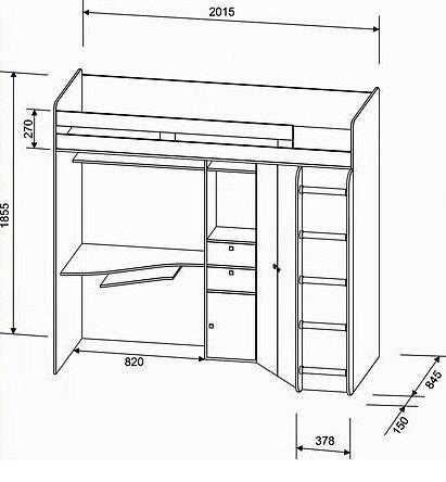 С одной стороны, расположен вместительный двустворчатый угловой шифоньер, с боку которого закреплена лестница, чтобы попасть наверх. С другой стороны, обустроено рабочее место под компьютер.