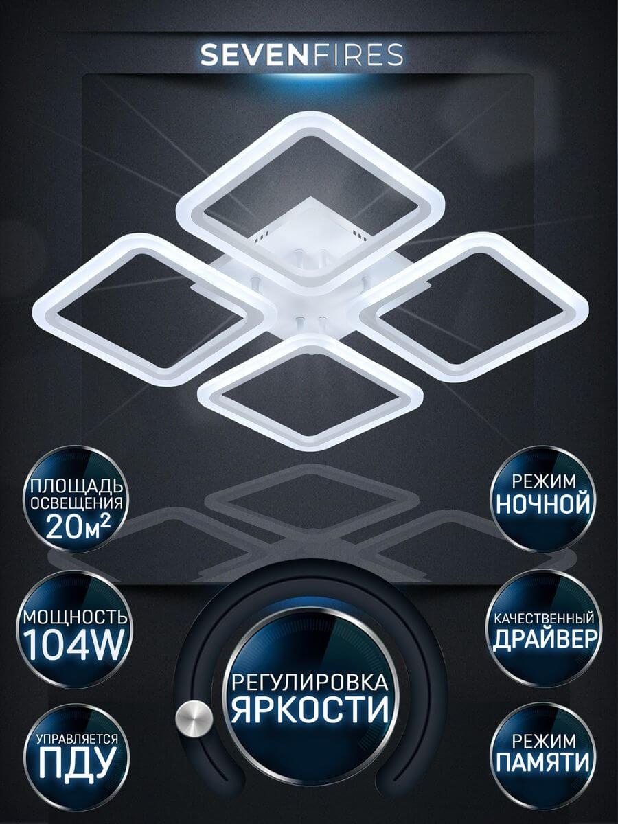 Особенная модель SF5041/4C-WT от российской компании Seven Fires относится к коллекции Barna и отлично подойдет для установки на низкий потолок спальни, оформленной в стиле хай-тек. Потолочная светодиодная люстра Seven Fires Barna SF5041/4C-WT с квадратными плафонами осветит помещение площадью 20 кв. м. холодным светом. Осветительный элемент встроен в конструкцию и не требует приобретения дополнительных лампочек. Прибор произведен с использованием материалов: акрил и металл и может использоваться для натяжного потолка. В комплект поставки входит пульт дистанционного управления. Основным цветом товара является белый. Потолочная светодиодная люстра SF5041/4C-WT с диммером продается по цене 3340 руб. Торопитесь сделать заказ в интернет-магазине SvetONe.