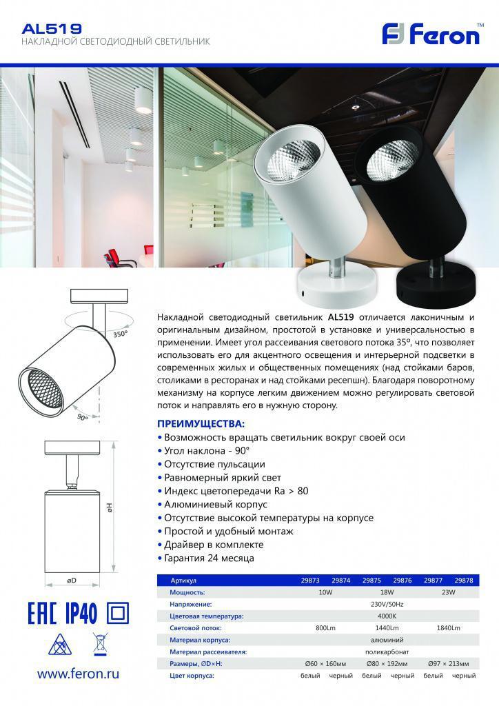 Светодиодный светильник Feron AL519 накладной 23W 4000K белый наклонный