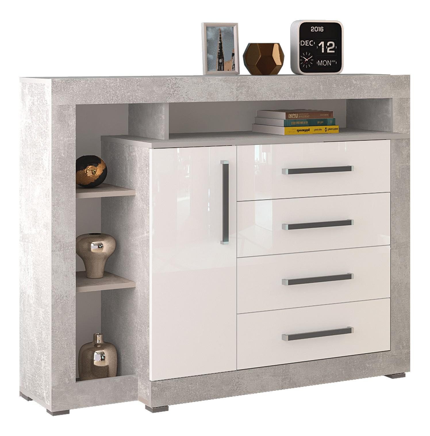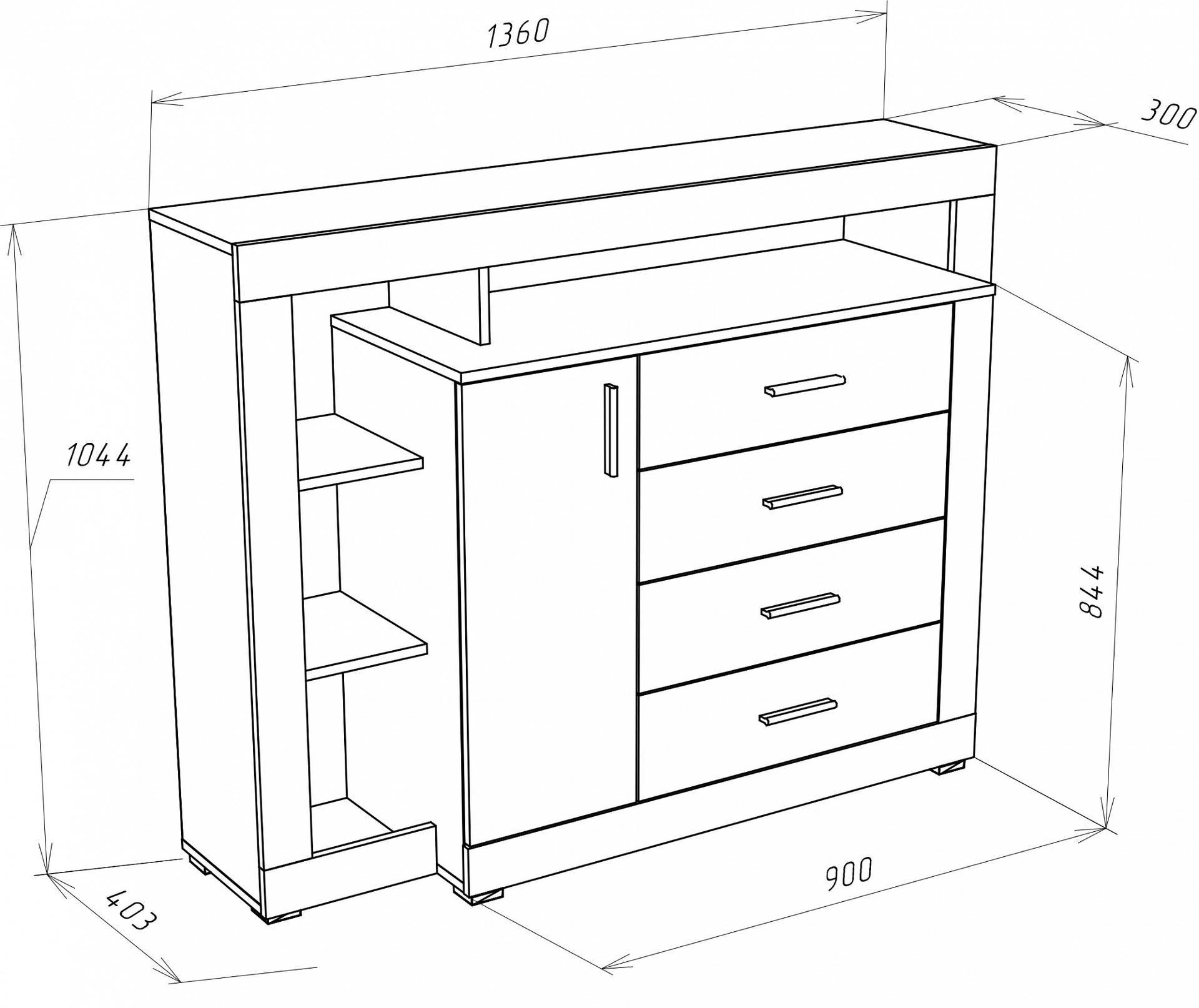 1 дверца, 4 ящика, полки