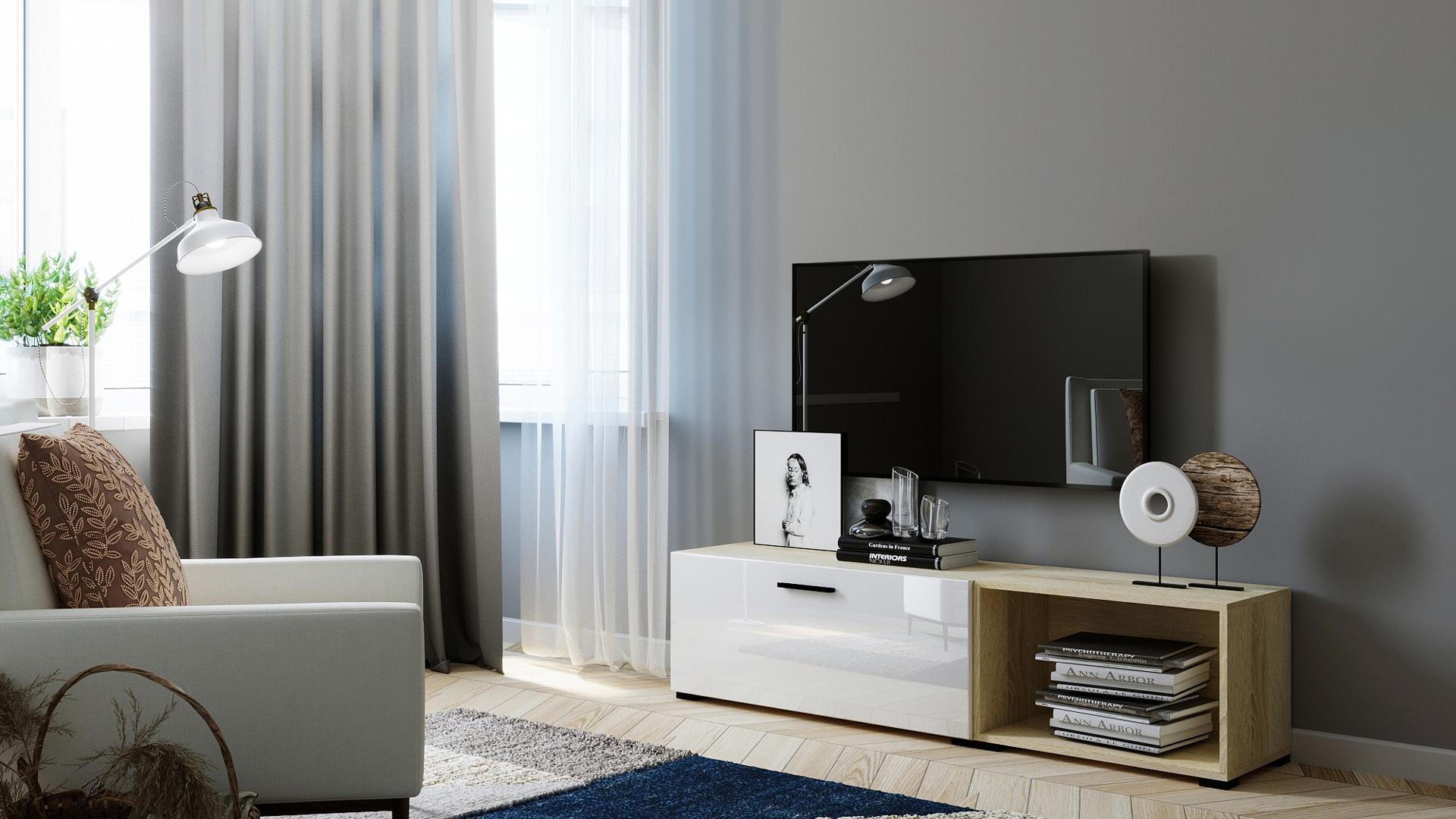 ТВ-тумба сделана из ЛДСП класса Е1 ведущего европейского производителя, фасад из экологичного МДФ, покрыт ПВХ глянцевой пленкой.