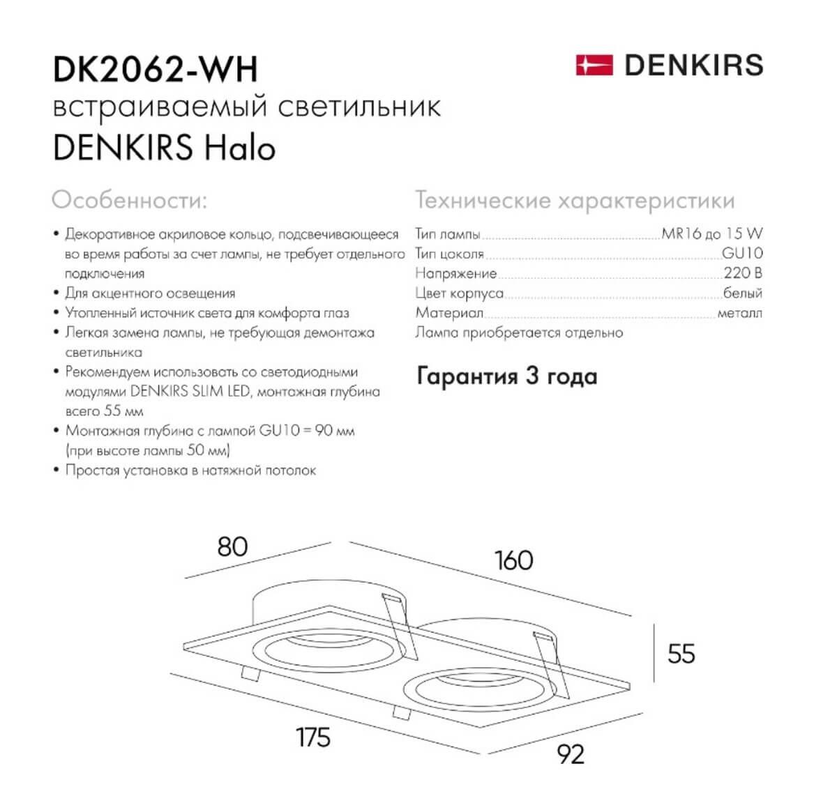 Интересная модель DK2062-WH от словенской компании Denkirs относится к коллекции DK2060 и отлично подойдет для установки прихожей, оформленной в современном стиле. Встраиваемый светильник Denkirs DK2062-WH с прямоугольными плафонами осветит помещение площадью 3 кв. м. Производитель Denkirs рекомендует использовать для устройства светодиодные лампы с цоколем GU10 и мощностью 15 W. Прибор произведен с использованием материалов: металл, алюминий и акрил и может использоваться для натяжного потолка. Основным цветом товара является белый. Встраиваемый светильник DK2062-WH продается по цене 2190 руб. Торопитесь сделать заказ в интернет-магазине SvetONe.